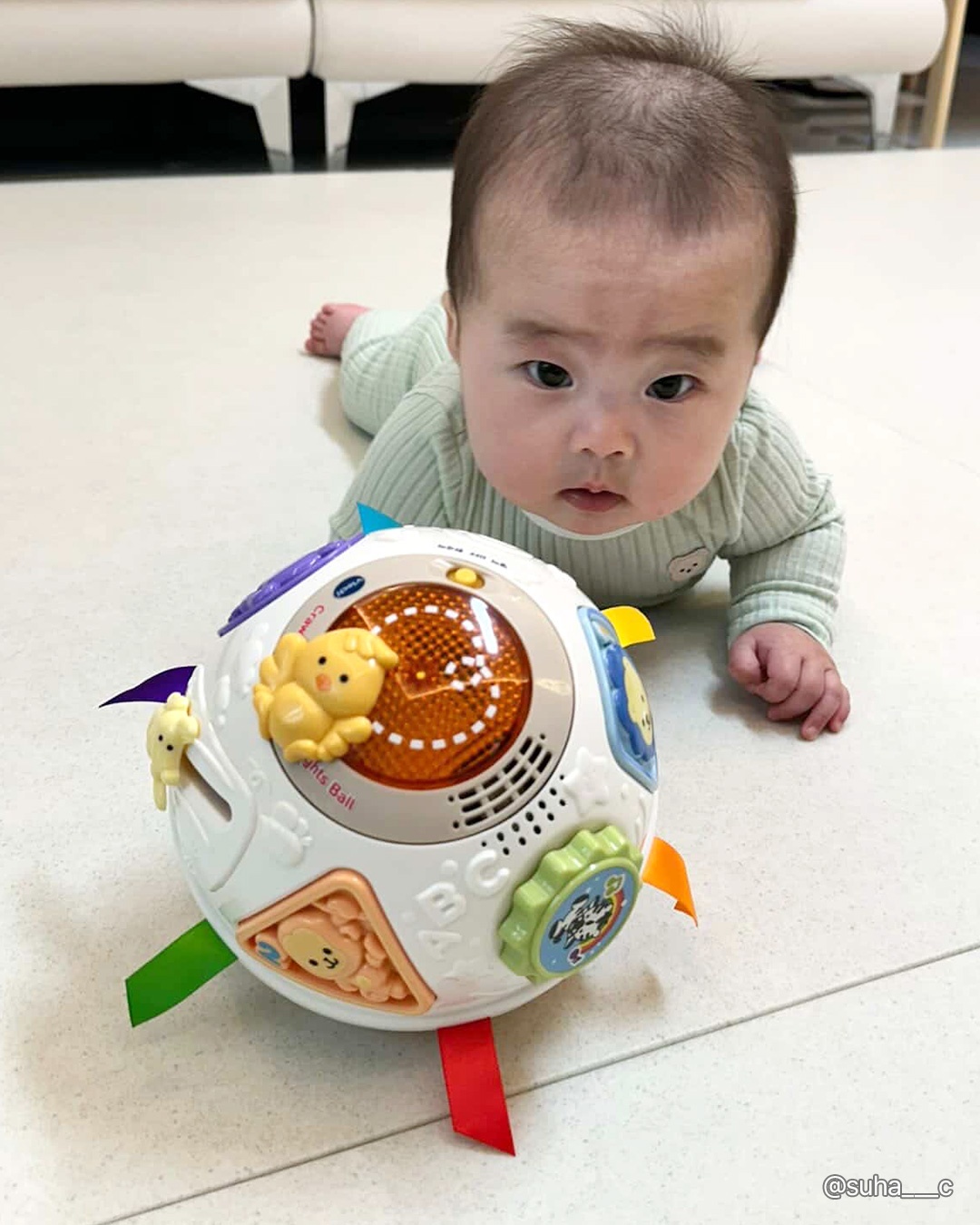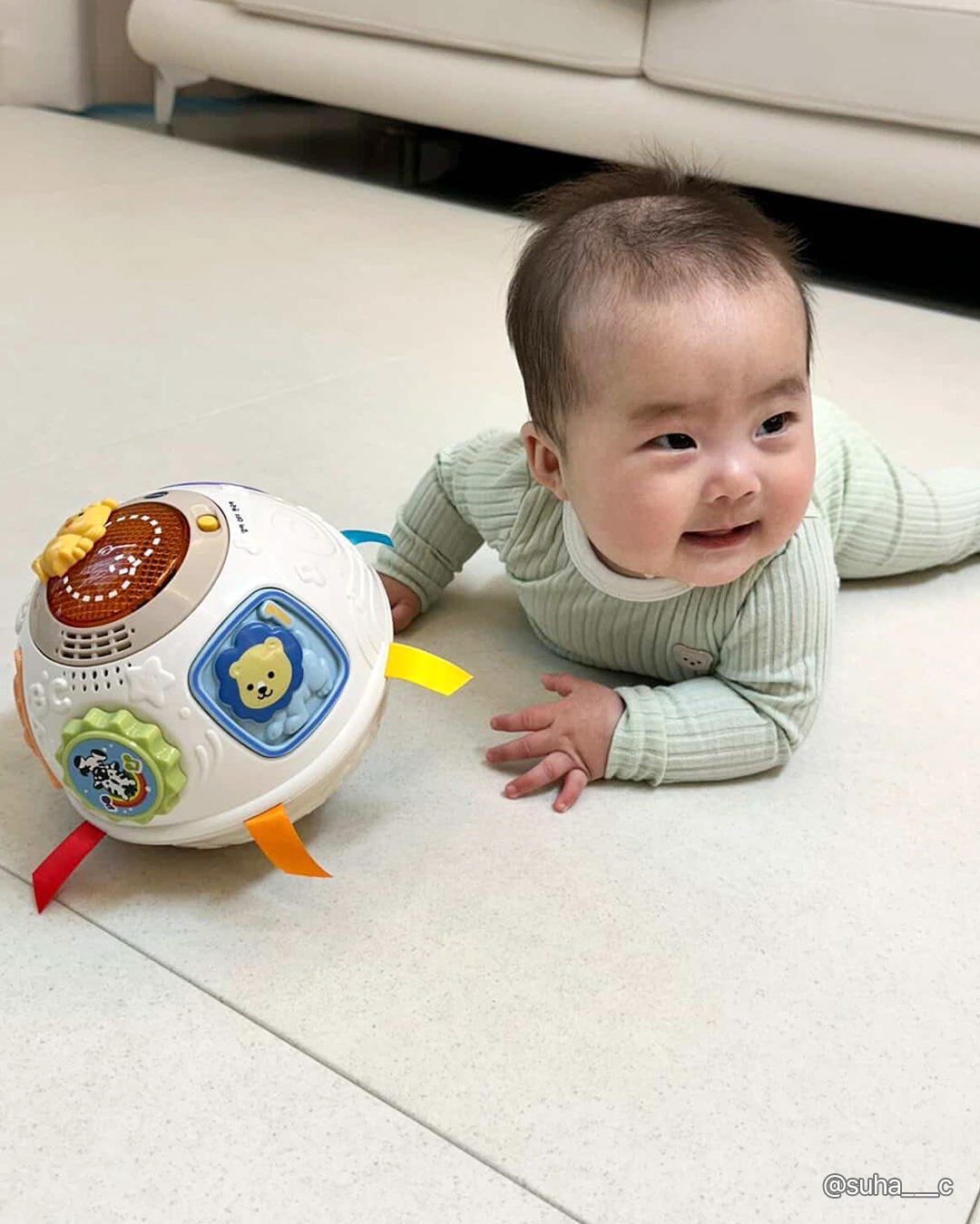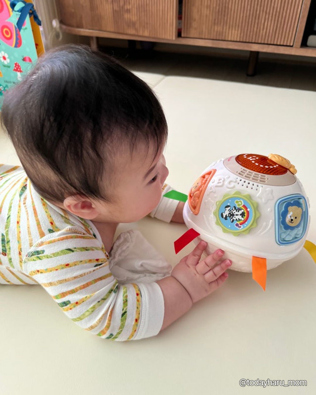그래서 브이텍의 깜짝볼은 아기 손이 닿을 듯 말 듯 한 거리에서 예측할 수 없는 방향으로 데굴데굴 굴러가며 경쾌한 멜로디를 내며 움직여서 5~7개월 아기의 발달에 도움이 되요.
