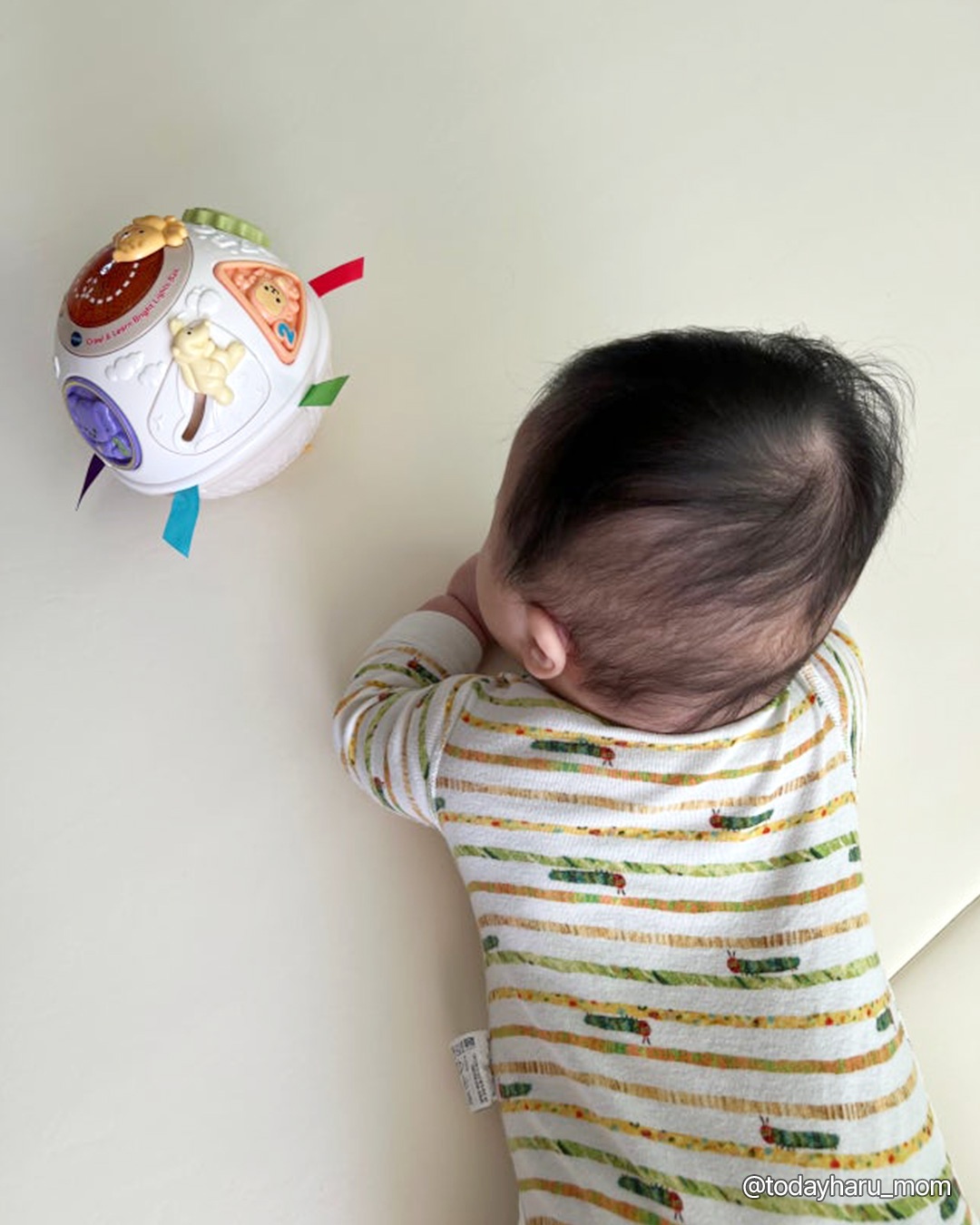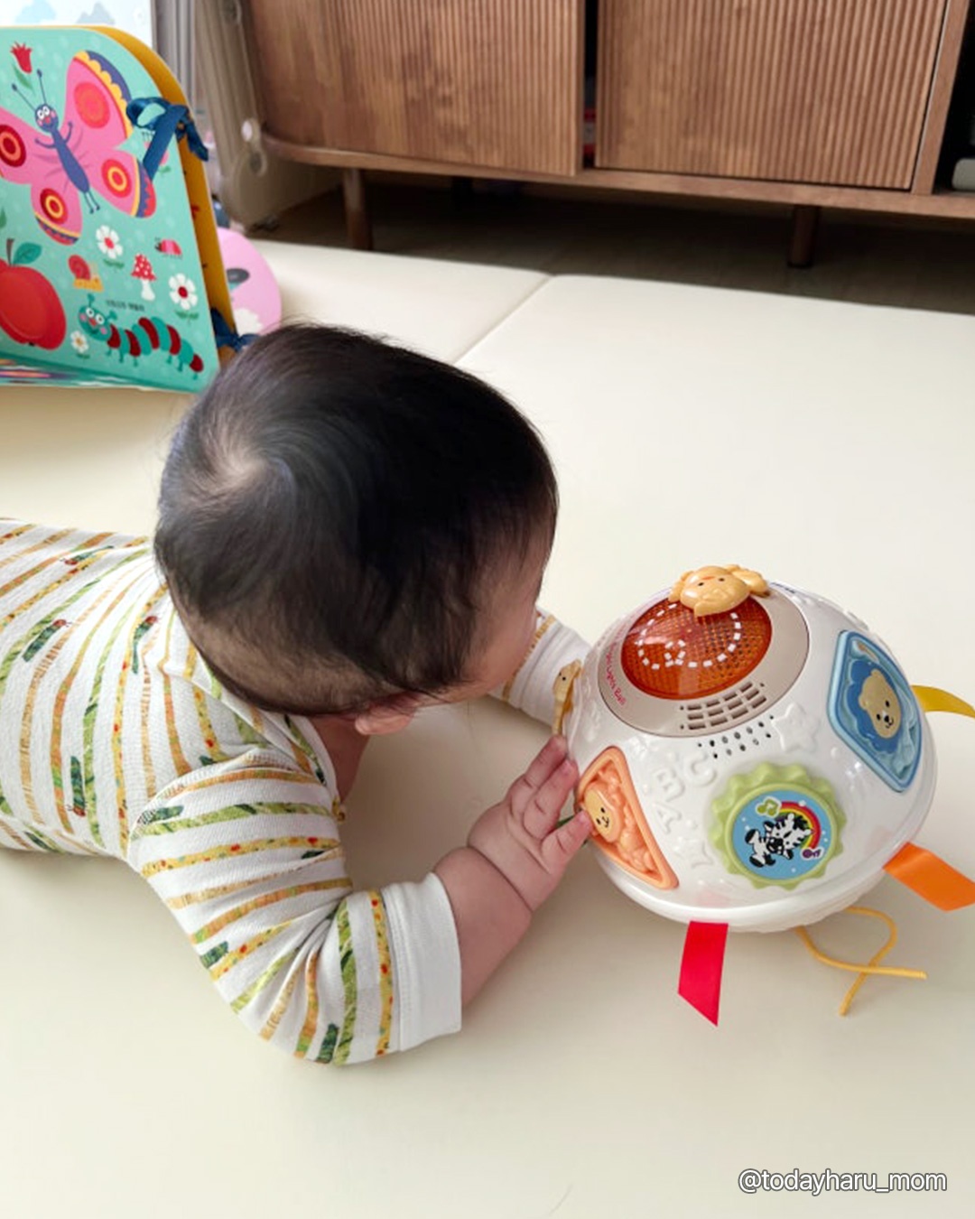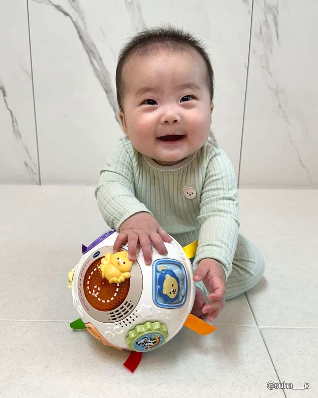 그래서 브이텍의 깜짝볼은 아기 손이 닿을 듯 말 듯 한 거리에서 예측할 수 없는 방향으로 데굴데굴 굴러가며 경쾌한 멜로디를 내며 움직여서 5~7개월 아기의 발달에 도움이 되요.