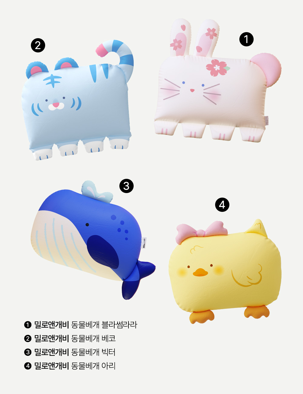 밀로앤개비 동물베개는 친숙한 동물 디자인으로 아이에게는 함께 자는 친구처럼 느껴질 수 있어요.